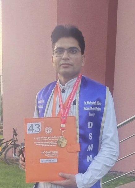 निशांत कुमार यादव को द्वादश दीक्षांत समारोह में कुलाधिपति माननीया राज्यपाल उत्तर प्रदेश आनंदीबेन पटेल, मुख्य अतिथि आयुक्त दिव्यांगजन,भारत सरकार माननीय एस.गोविंद राज, विशिष्ट अतिथि माननीय राज्यमंत्री स्वतंत्र प्रभार पिछडा वर्ग कल्याण एवं दिव्यांगजन सशक्तिकरण विभाग नरेंद्र कश्यप द्वारा कुलपति आचार्य संजय सिंह जी की उपस्थिति में प्राप्त हुआ।